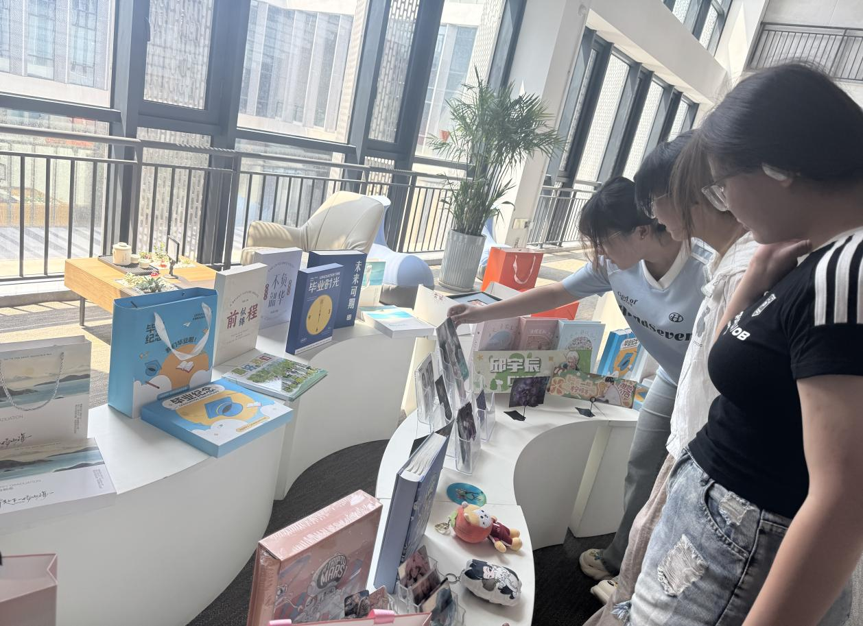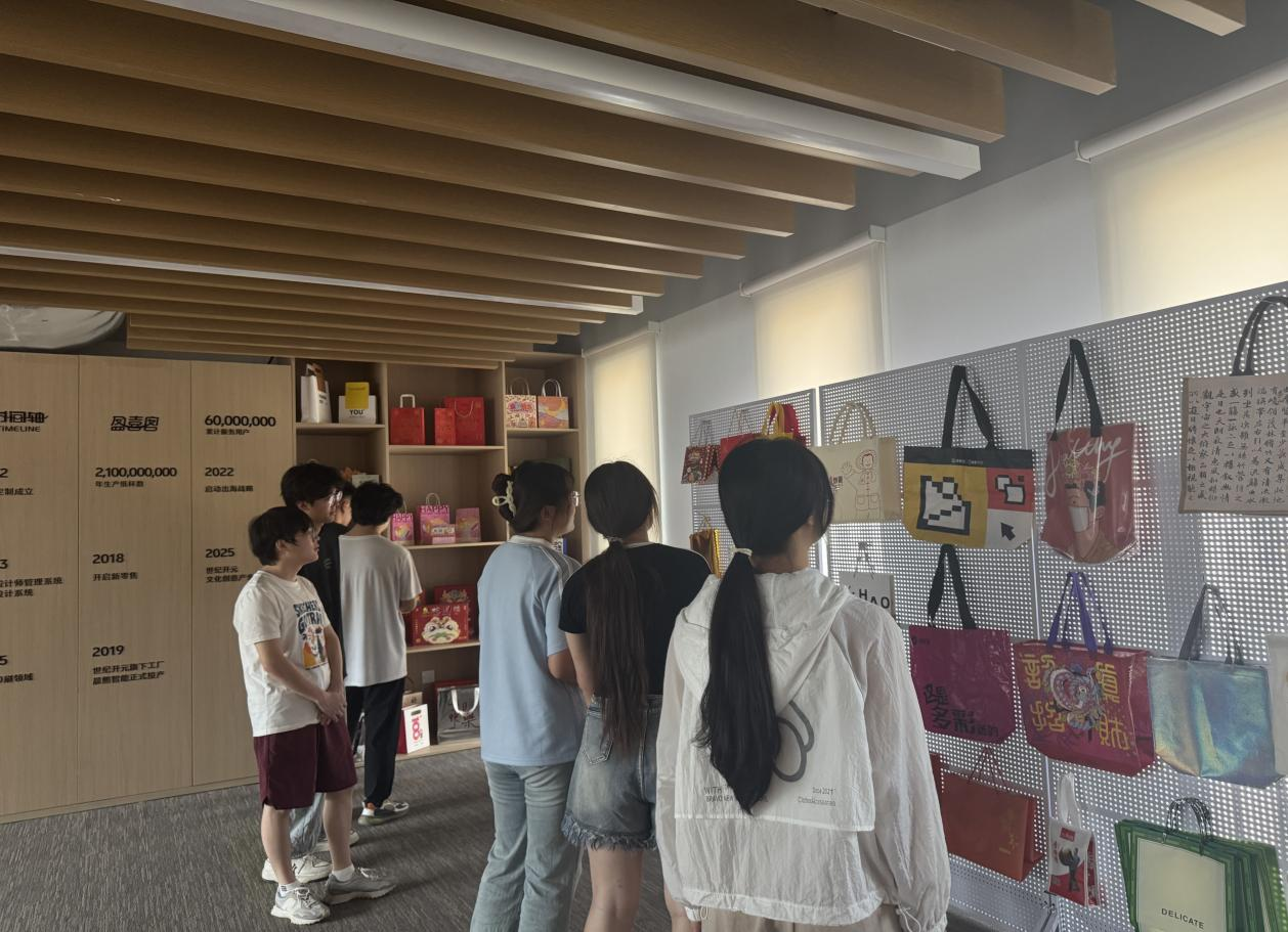 同学们首先来到了公司设计的文创商品展示区。一进入展示区,琳琅满目的文创产品便吸引了大家的目光。从精美的个性化定制笔记本、独具匠心的创意台历,到充满艺术感的装饰画,每一件作品都彰显着世纪开元在文创设计领域的深厚功底。这些文创商品不仅在设计上别出心裁,更巧妙地融入了电子信息技术的元素,如通过AR技术让静态的画作“活”起来,为消费者带来全新的互动体验。同学们纷纷驻足欣赏,不时拿出手机记录下这些充满创意的作品,并与身边的同学交流自己的感受和想法。