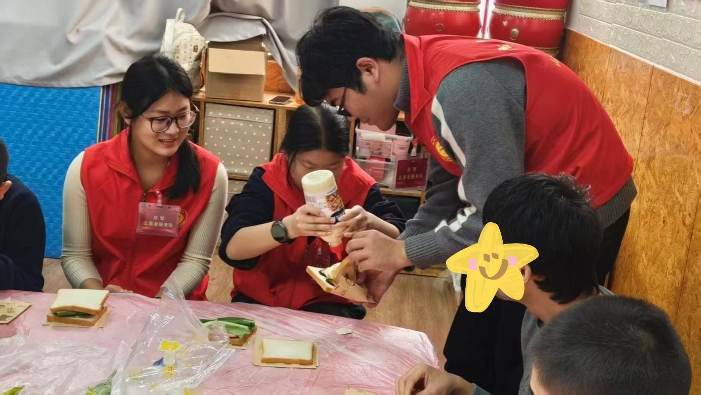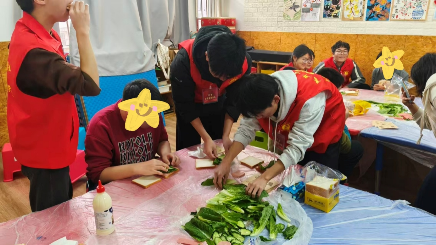 志愿者们与孩子们一起动手制作三明治,他们为孩子们分发了切片面包、新鲜蔬菜、火腿等食材,耐心示范涂抹酱料和叠放夹层的步骤。在志愿者的陪伴与鼓励下,孩子们积极参与,共同完成了三明治的制作,并一起享用了这份美味。